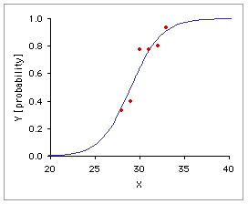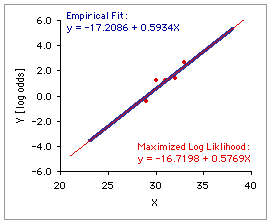 X | Observed Probability | Log Odds | Weight | C. Weighted Linear Regression of C. Observed Log Odds on X ![]() 28 | 29 30 31 32 33 .3333 | .4000 .7778 .7778 .8000 .9333 -.6931 | -.4055 1.2528 1.2528 1.3863 2.6391 6 | 5 9 9 20 15 For each level of X, the weighting factor is the number of observations for that level. |